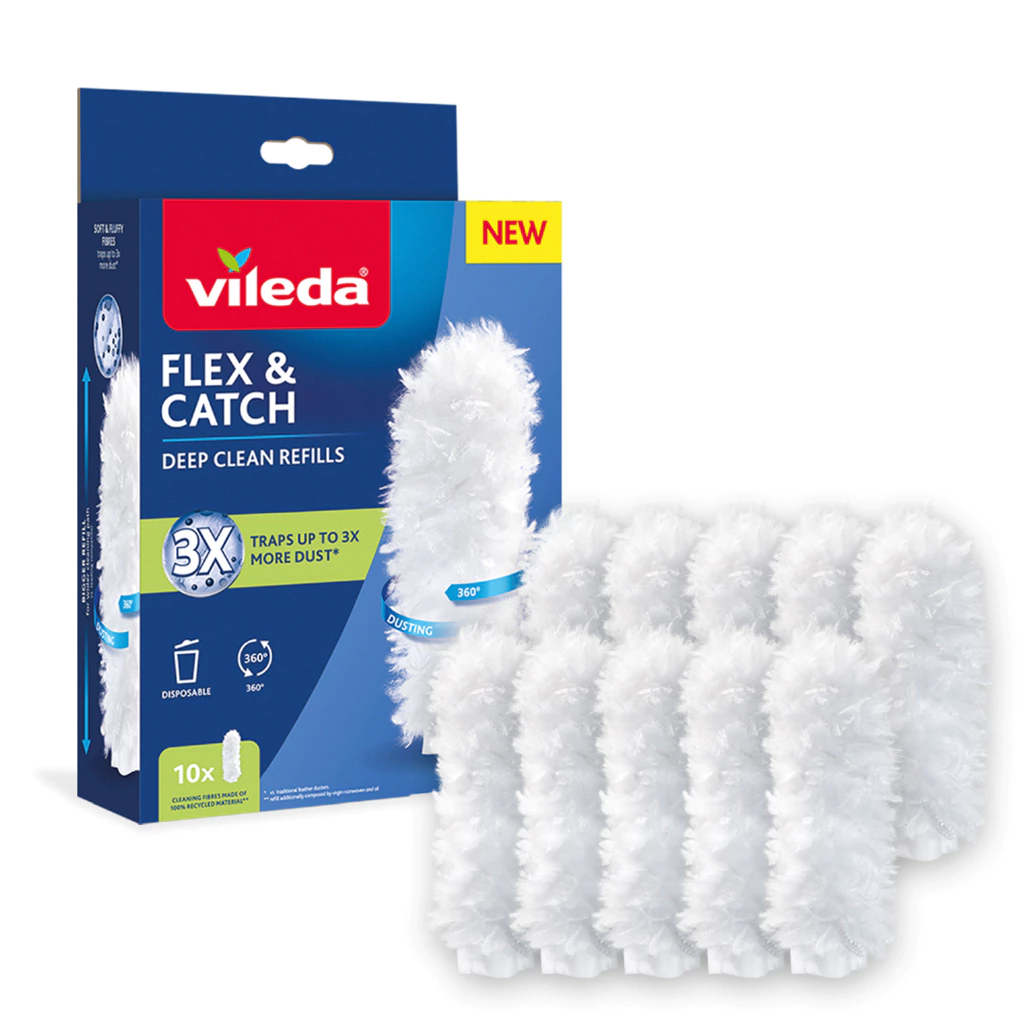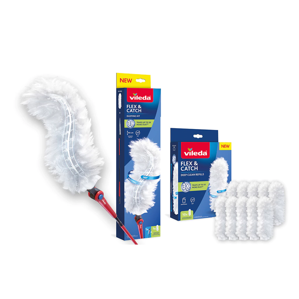 Vileda Flex & Cach plumero con flexibilidad única ,el cabezal captura la suciedad sin esfuerzo. Se adapta fácilmente a alrededor de objetos. Diseñado con fibras suaves y esponjosas con material 100% reciclable atrapan hasta 3 veces mas el polvo.